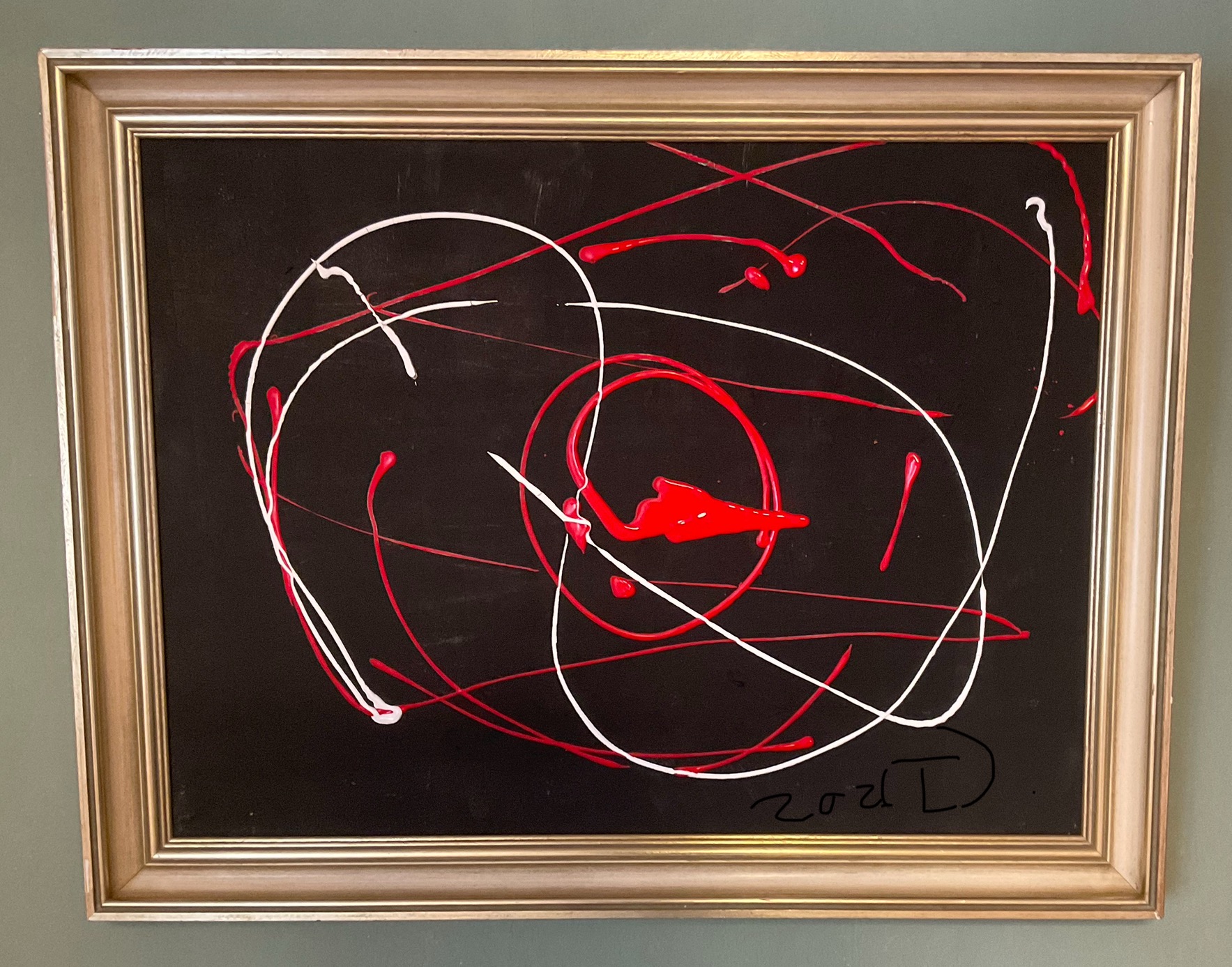 This painting is all about movement, tension and rhythm — powerful red and white acrylic lines cutting through deep black space like a signal, a pulse, an orbit.