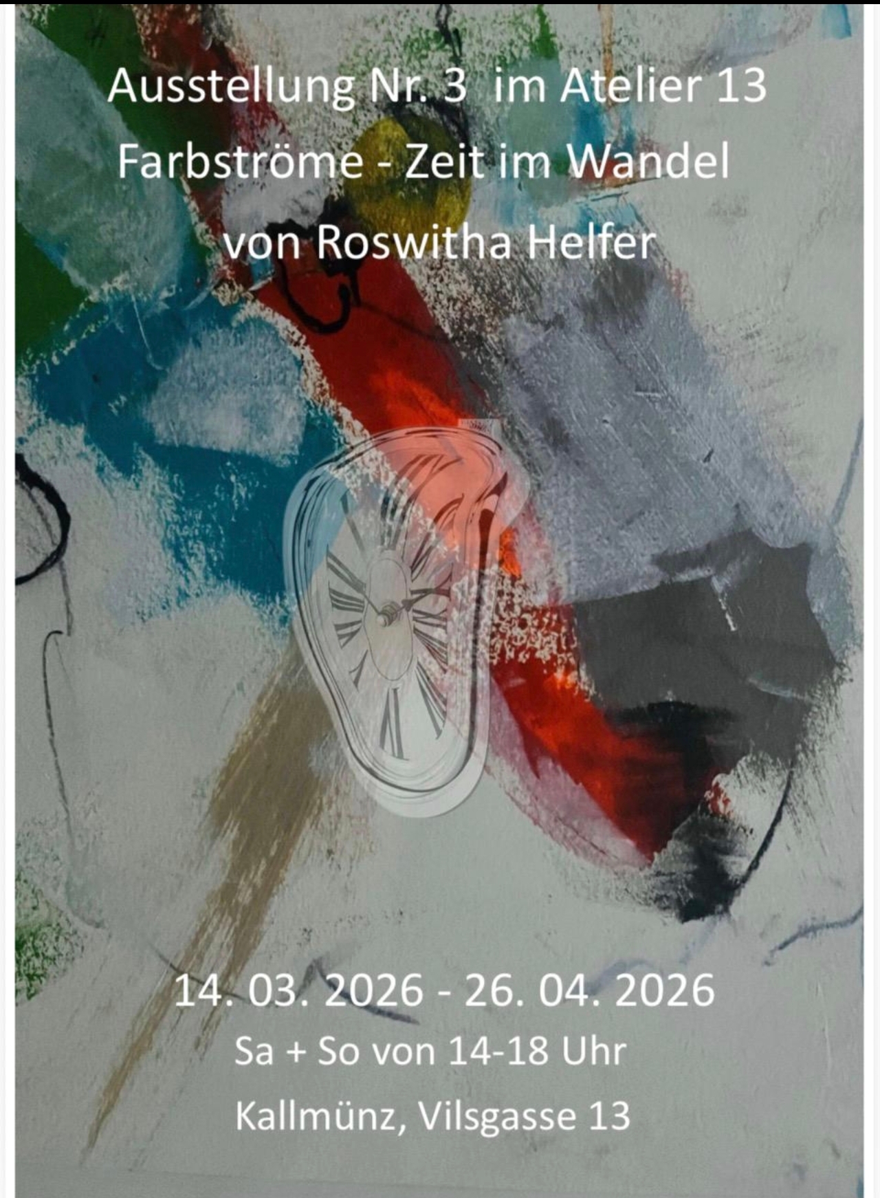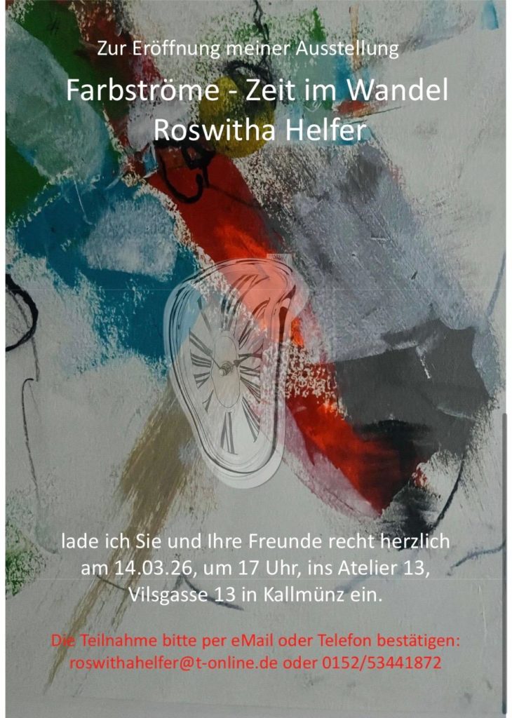 Am 14. März 2026 um 13 Uhr öffnet das Atelier 13 in Kallmünz seine Türen zur Vernissage der Ausstellung „Farbströme – Zeit im Wandel“ der Künstlerin Roswitha Helfer.