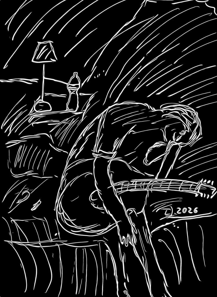 This artwork captures a quiet moment of reflection: a lone musician sitting with his guitar in a silent room. No audience, no noise, just the weight of thoughts and the presence of the instrument. The cool turquoise tones create an almost dreamlike atmosphere, where echoes of sound seem to linger in the walls.